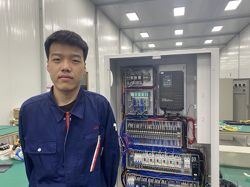 唐老師在光洋人事王女士陪同下,來到了裝配車間,看到了正在這里工作的學生,在這個工作區域有17級機電一體化專業的畢業生馮堯和關翯遠,還有19級機電一體化專業實習生崔寶科,學生們對于唐老師的到來,也表現的非常高興,通過與學生的聊天,唐老師得知,馮堯和關翯遠兩名同學在2020年就已經轉正,成為了企業正式員工。馮堯同學表示,在企業工作這兩年,收獲了很多,也成長了很多,從剛進入企業實習的“菜鳥”,到現在已經能獨立完成配電柜的組裝,確實有很多艱辛要付出,但是現在看看,所有的付出也都是值得的。關翯遠同學說,在這里,老的員工對于新人都很照顧,和大家都相處的很好,早已經把自己徹底的融入到了企業中去,也讓老師和學校放心,我們在這里一定會好好工作,照顧好新來的學弟。